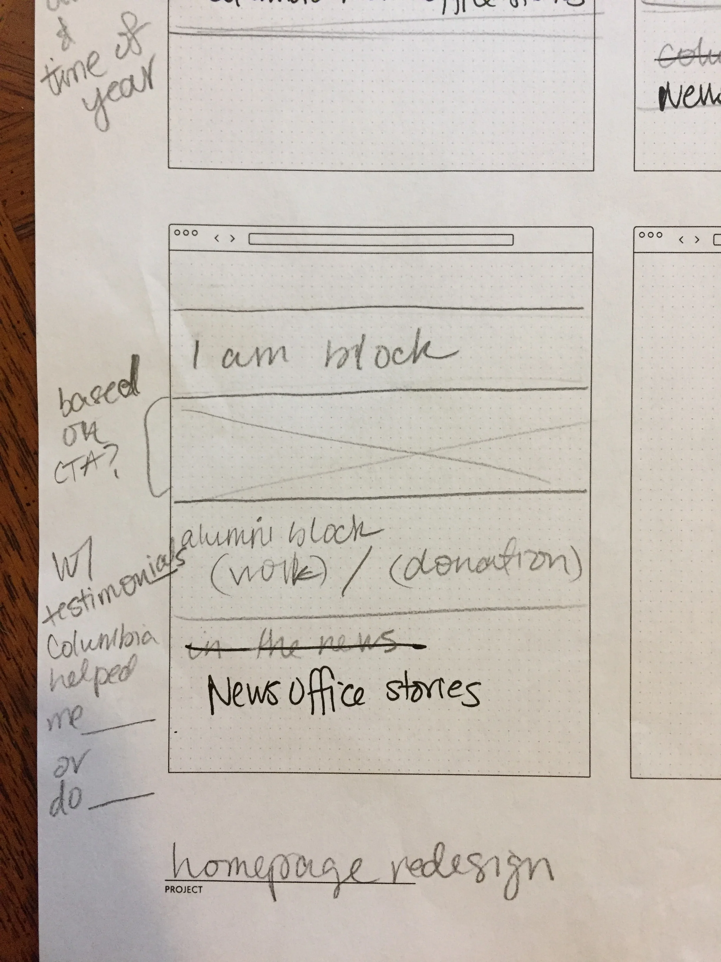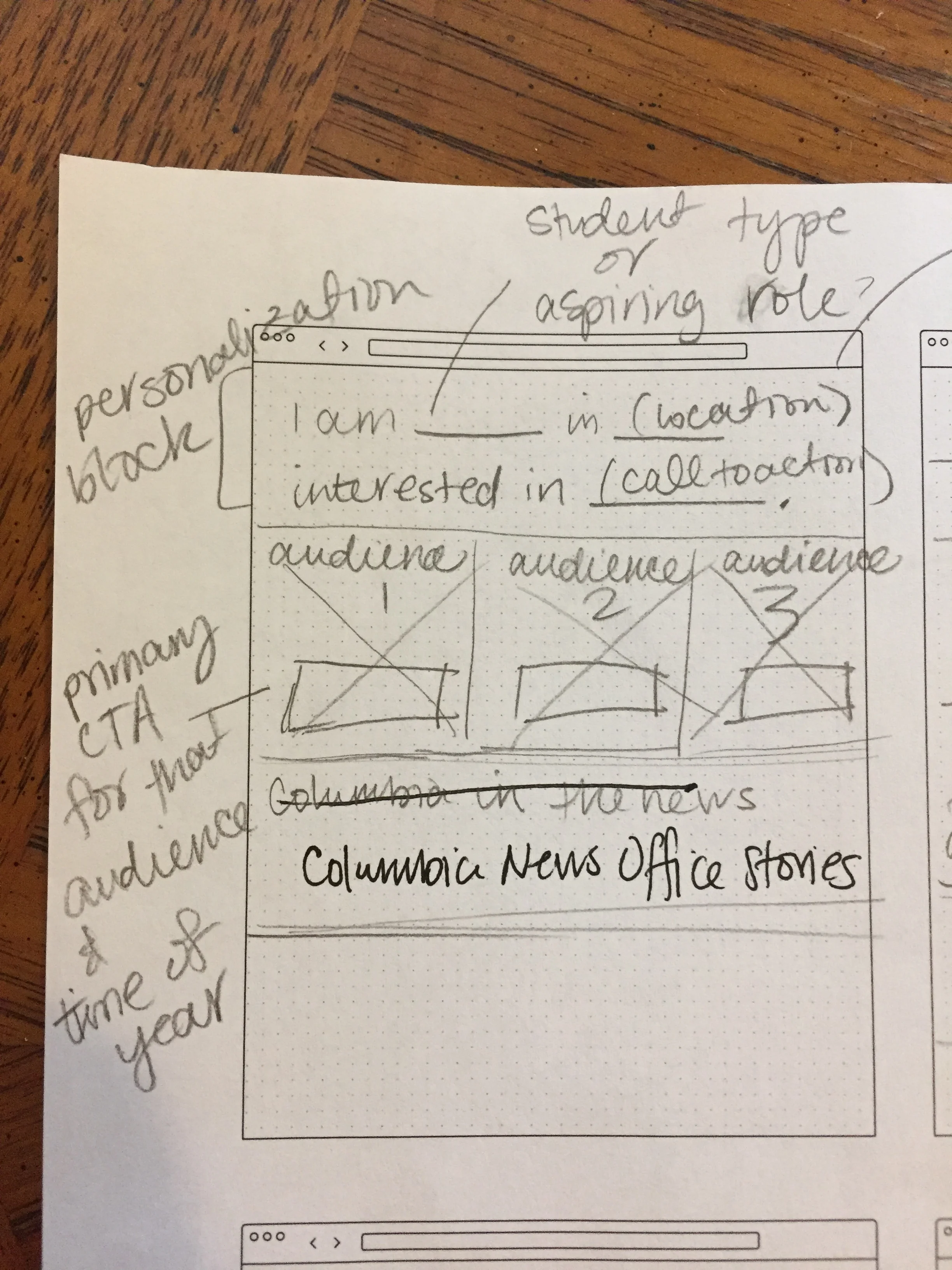 Reviewing the analytics showed that the homepage was used mostly as a gateway for the majority of website traffic, but it also showed the navigation was clear enough that people are comfortable using that. I developed new personas for all the primary audiences for the website — prospective students, parents, journalists, alumni, donors, and other influencers. This was instrumental in developing a content calendar with stakeholders and leading them through the redesign process. I created an initial design to prototype and test based on the top primary audiences (prospective students, current students, family members, and alumni). I worked with a visual designer and the developers to finalize the page, while I was responsible for all the research and the content development.